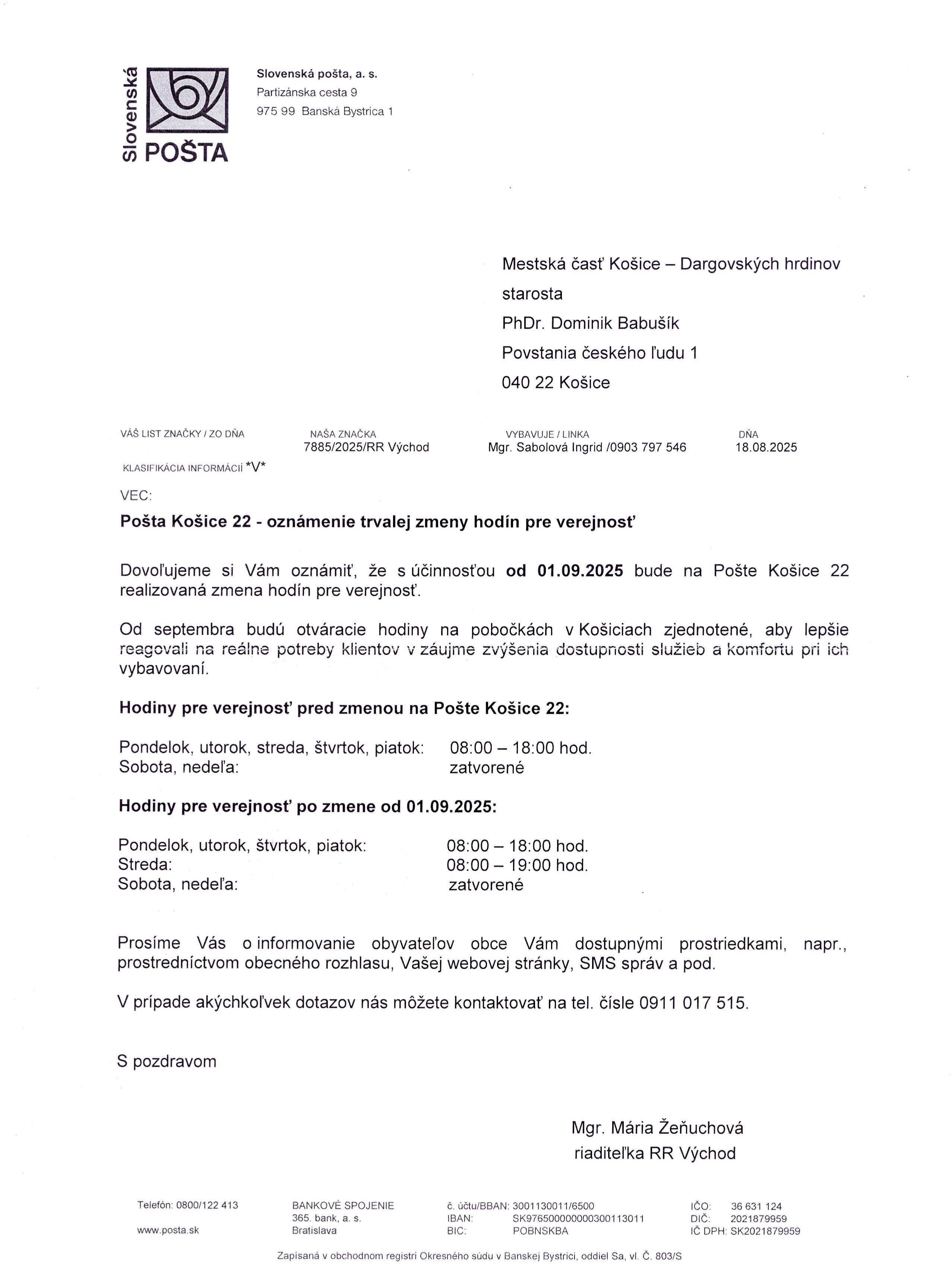 Pošta Košice 22 - oznámenie trvalej zmeny hodín pre verejnosť