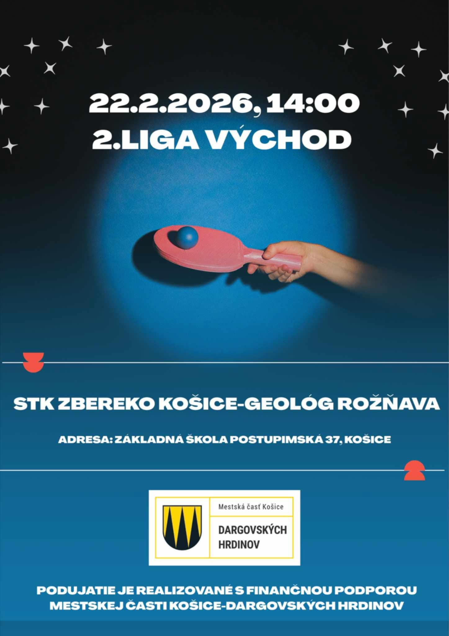 Už túto nedeľu o 22. februára odštartujeme prvé z 22 podujatí, ktoré sme podporili v rámci dotácií z rozpočtu našej mestskej časti. V spolupráci so Stolnotenisovým klubom STK Zbereko Košice 14:00 hod. Vás pozývame na druholigový zápas proti Geológ Rožňava B, ktorý sa uskutoční v nedeľu o 14.00 hod. v malej telocvični ZŠ Postupimská 37.